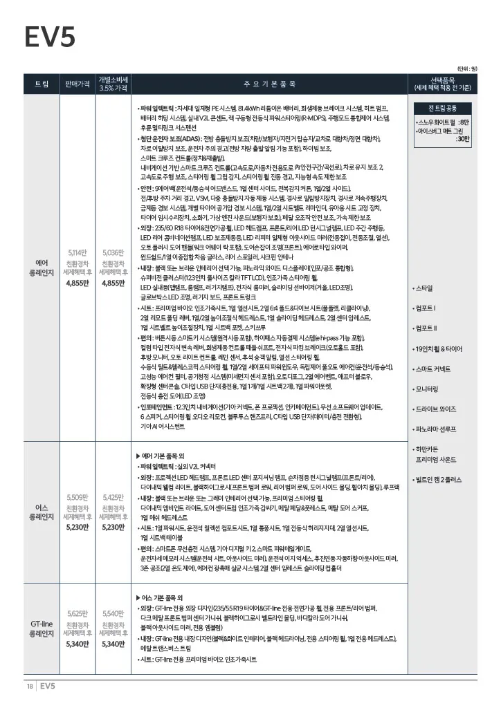 이러한 변수를 고려하여 당신에게 가장 적합한 기아 ev5 옵션선택 조합과 최종 예산을 확정하세요.