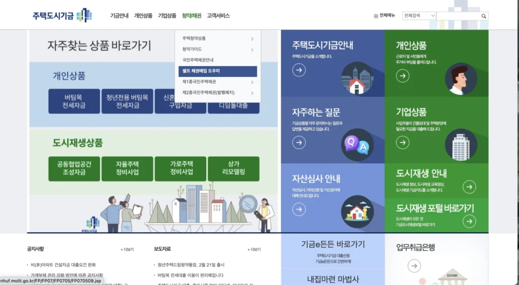 - 접속 경로: 주택도시기금 포털 접속 후 “청약/채권”을 클릭하고, “셀프 채권매입 도우미”를 클릭합니다.